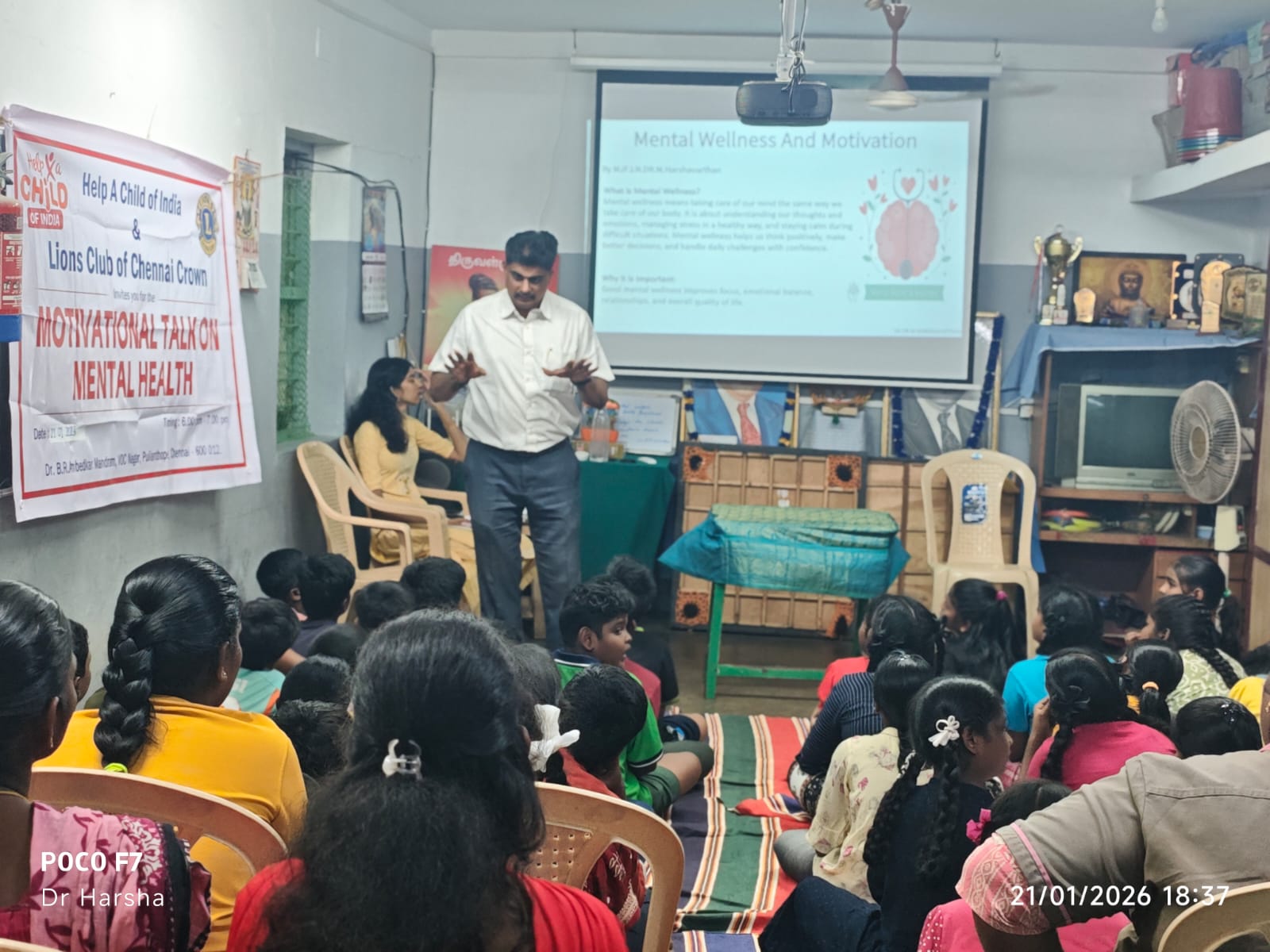 At Help A Child of India, we believe that a child's growth is not complete without mental and emotional well-being. As part of our ongoing commitment to the mental health of children and the community, we organized a Motivational Talk on Mental Health on 21st January 2026 at Purasaiwakkam Chennai, in collaboration with the Lions Club of Chennai Crown.