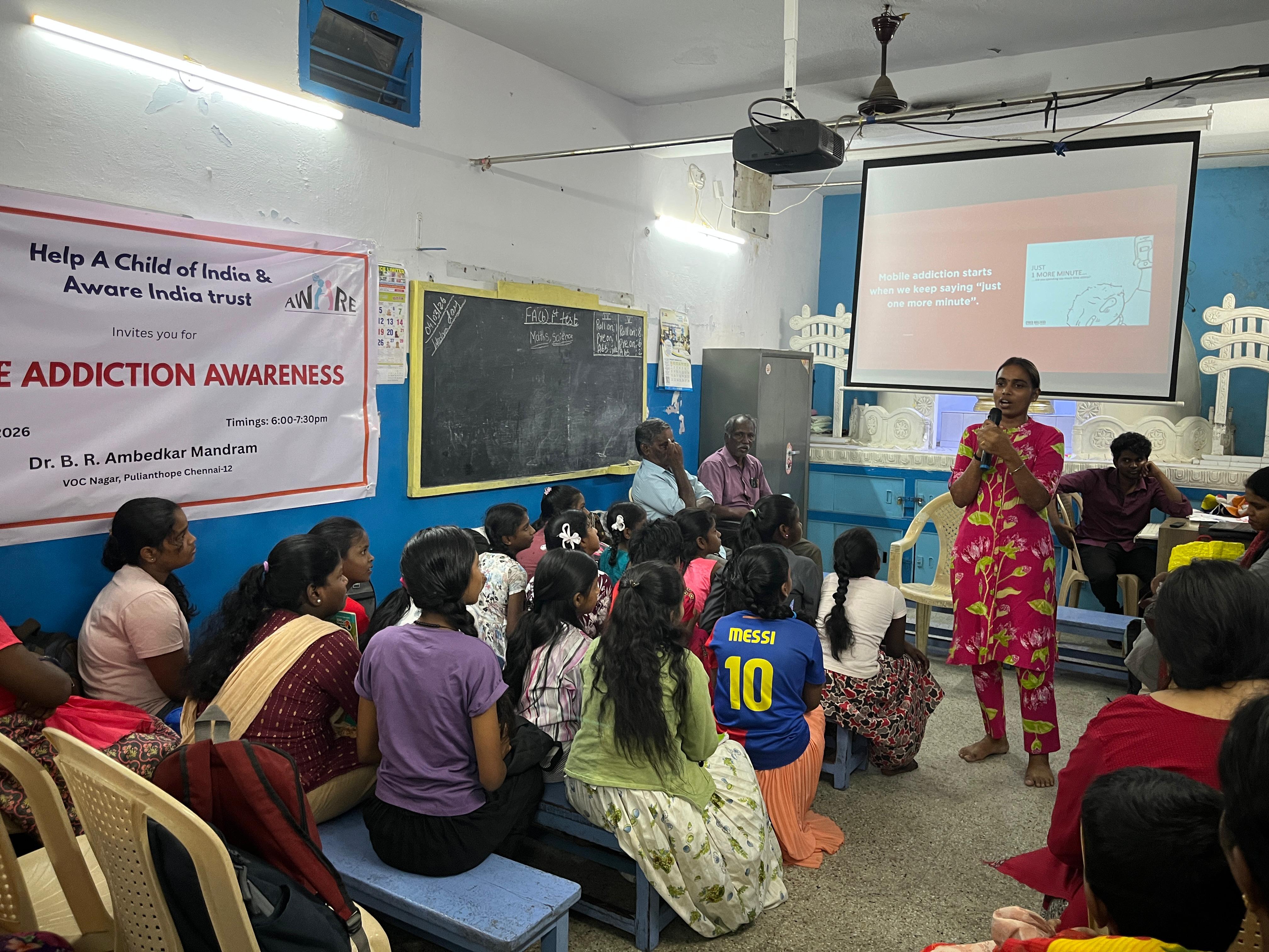 In today’s digital world, mobile phones have become an essential part of daily life. While technology offers numerous benefits in education and communication, excessive mobile usage has led to growing concerns about mobile addiction among children and adolescents. To address this issue, a Mobile Addiction Awareness Program was organized by Help A Child of India in Collaboration with Aware India trust to educate students about responsible mobile usage and its impact on physical and mental health on 4th March 2026 at Dr. B.R Ambedkar Mandram. Ms. Enitha Ramesh, Lawyer and Legal training associate at Aware India trust shared the insights and highlighted the signs and symptoms of mobile addiction and how it’s impacting our health and sleep pattern. She explained the role of parents in shaping children’s career. She provided practical tips to reduce screen time and enhance life. She suggested setting screen times, mindfulness exercises and offline activities to overcome mobile addiction. She conducted activities for the children and engaged them insisting the importance of healthy mobile habits. MSW students from the Loyola College Chennai and Pondicherry university performed puppetry based on the theme. Participants reported increased awareness about mobile addiction and committed to reducing screen time. They also interacted with the resource person sharing their experiences and tips on social media using. Participants gave positive feedback and rated the program as impactful. The program was highly informative and engaging. Students expressed their willingness to reduce unnecessary mobile usage and adopt healthier habits. Many students shared that they would create a daily schedule to balance studies and screen time. Students took a pledge to: Limit daily screen time, Avoid mobile usage during study hours, Spend more time in outdoor and creative activities.